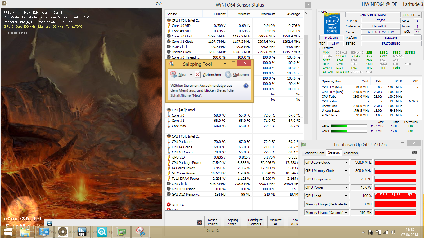 Den einstündigen Stresstest absolviert das Latitude 3340 mit 1,2 bis 1,3 GHz leicht schwankend an der CPU und 900 MHz an der HD 4400. Hier tritt also ein, was wir oben bei den Leistungstest nicht vorfanden: thermisches Throttling. Die Lüftung ist in dieser (eher praxisfernen) Extremsituation nicht mehr zu ausreichender Kühlung in der Lage, weshalb der SoC den Takt senkt. Hier ist das aber bereits bei 70 Grad der Fall. Die Drosselung hat maßgeblich mit der Aktivität der HD 4400 zu tun. Sobald wir Furmark (GPU-Stress) nämlich abschalten, schnellt der CPU-Takt wieder auf 2,2 GHz hinauf. Wie die CPU-Benchmarks jedoch gezeigt haben, wird der i5 4200U in der Praxis jederzeit seine standesgemäße Leistung einfahren.