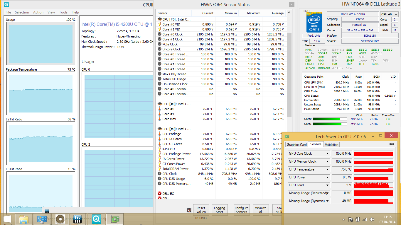 Wie setzt der Core i5 4200U unter Last seinen Turbo ein? Prime95 setzt alle vier Kerne unter Last, der Takt verharrt dann bei 2,2 GHz. Das ist etwas weniger als die versprochenen 2,6 GHz, welche aber sowieso nur für Single-Thread (ein Kern) gelten. Die Temperatur liegt während dieses Tests bei 75 Grad.