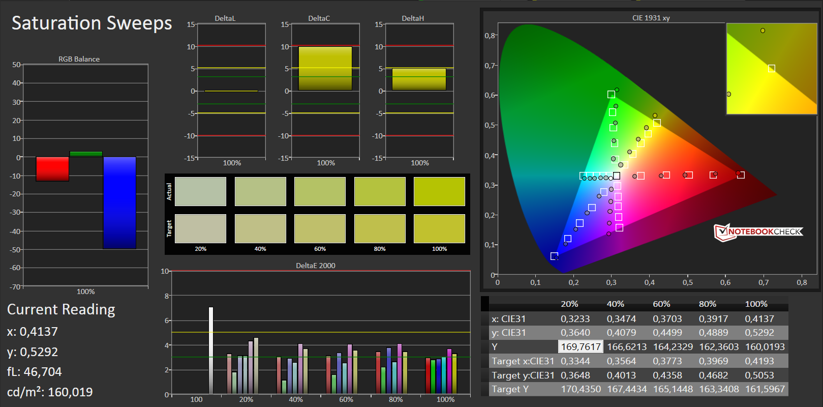 Die CalMan Messung bestätigen die positive Farb- und Graustufendarstellung eines IPS-Panels, obwohl die Abweichungen eher im Mittelfeld dieser Bauart liegen. Hierbei sprechen wir von einem deltaE-Wert der Graustufen von 4,28 und 3,94 der Farben.