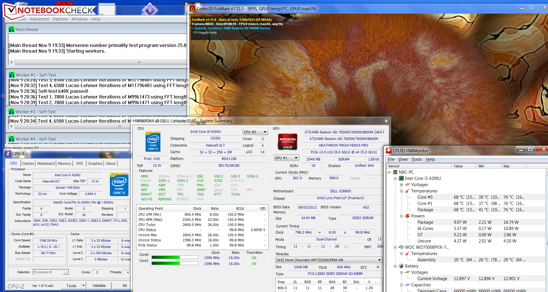 Den Stresstest (Prime95 und Furmark laufen für mindestens eine Stunde) beginnt die CPU im Netzbetrieb mit 2,2 bis 2,3 GHz. Sobald eine CPU-Temperatur von 76 Grad Celsius erreicht wird, tritt eine Drosselung des Prozessors auf 1,6 GHz ein. Dies war bei uns nach etwa 10 Minuten der Fall. Erst wenn die CPU-Temperatur auf einen Wert unterhalb von 66 Grad Celsius sinkt, steigt die Geschwindigkeit wieder auf den ursprünglichen Wert. Das wurde noch einmal geschafft, so dass die CPU für weitere 2 Minuten mit 2,2 bis 2,3 GHz arbeiten konnten. Danach hat der Prozessor für die restliche Dauer mit 1,6 GHz gearbeitet. Die GPU hat den Stresstest im Netzbetrieb mit permanent schwankender Geschwindigkeit absolviert. Es wurden Werte zwischen 300 und 625 MHz erreicht. Das Kühlsystem des Notebooks ist also nicht in der Lage CPU und GPU bei voller Geschwindigkeit ausreichend zu kühlen. Wird der Stresstest im Akkubetrieb durchgeführt, arbeitet die CPU permanent mit 2,2 bis 2,3 GHz. Eine Drosselung tritt nicht ein, da die Temperaturschwelle von 76 Grad Celsius nicht überschritten wird. Die GPU arbeitet dauerhaft mit 400 MHz.
