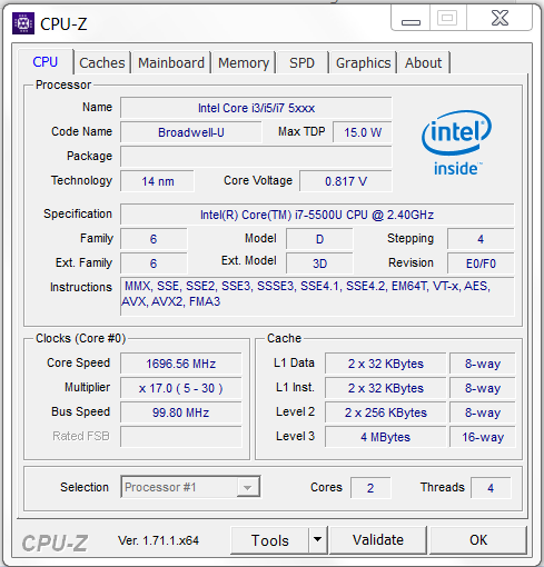 Innerhalb der Latitude 3550 Reihe steht eine große Bandbreite von Prozessoren zur Auswahl bereit. Vom Celeron bis zum Core i7 sind Modelle aus jeder Leistungsklasse verfügbar. In unserem Testgerät steckt mit dem Core i7-5500U Prozessor die stärkste unter den verfügbaren CPUs. Es handelt sich hierbei um einen Broadwell Prozessor, der mit einer Basisgeschwindigkeit von 2,4 GHz arbeitet. Mittels Turbo kann die Geschwindigkeit auf 2,9 GHz (zwei Kerne) bzw. 3 GHz (ein Kern) beschleunigt werden. Auf Seiten der Leistungsentfaltung gibt es keine Probleme. Die CPU arbeitet in der Regel immer mit voller Geschwindigkeit. Lediglich bei der Abarbeitung von Multi-Thread-Anwendungen im Akkubetrieb wird die CPU minimal abgebremst. Sie arbeitet dann mit 2,8 bis 2,9 GHz statt mit konstanten 2,9 GHz. Das Ganze schlägt sich in minimal geringeren Resultaten nieder.