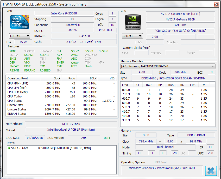 | Dell Latitude 15 3550-0123 5500U, GeForce 830M | Dell Latitude 13 3540 4200U, Radeon HD 8850M | Lenovo ThinkPad Edge E550-20DGS00300 5005U, HD Graphics 5500 | Lenovo Thinkpad E555 A8-7100, Radeon R5 (Kaveri) | Acer TravelMate P256-M-39NG 4005U, HD Graphics 4400 | HP ProBook 450 G2 L3Q27EA 5200U, HD Graphics 5500 | Acer Aspire V3-574G-59MA 5200U, GeForce 940M | HP Pavilion 15-ab022ng 5500U, GeForce 940M | |