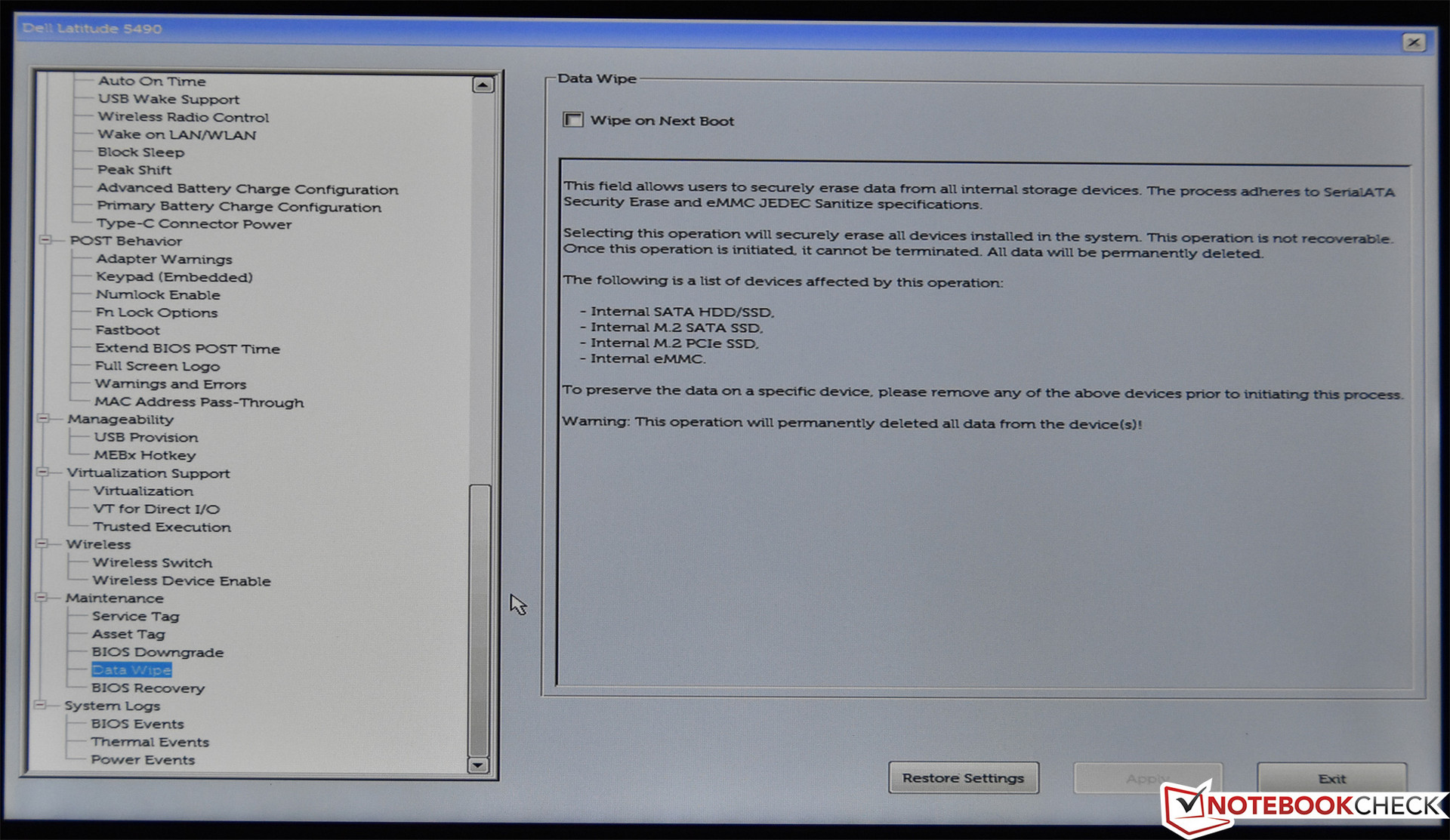In unserem vorherigen Artikel wurde darauf nicht eingegangen, aber es sollte unbedingt noch erwähnt werden, dass das BIOS-Setup des Latitude 5490 eins der durchdachtesten und funktionsreichsten aller existierenden Notebooks ist. Darin lässt sich praktisch jede Option finden, die man sich vorstellen kann, zusammen mit einer Vielzahl anderer Extras – zum Beispiel die Möglichkeit, ein BIOS-Downgrade zu erzwingen oder für den nächsten Systemstart eine automatische Löschung des internen Speichers festzulegen.