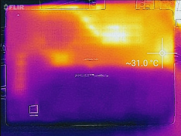 Im Leerlauf gibt es allerdings bedeutende Unterschiede. Auch unter Berücksichtigung von Abweichungen in der Umgebungstemperatur sind die Durchschnittswerte der Ober- bzw. Unterseite von 26,3 °C bzw. 28,4 °C einige Grad höher als beim Core i5-Modell und manche Stellen wie das zentral-rechte Areal auf der Unterseite des Geräts sind mehrere Grad wärmer als die Umgebungstemperatur. Für temperaturempfindliche Nutzer dürfte sich dies als äußerst störend erweisen, wenn man das Gerät auf dem Schoß benutzen möchte.