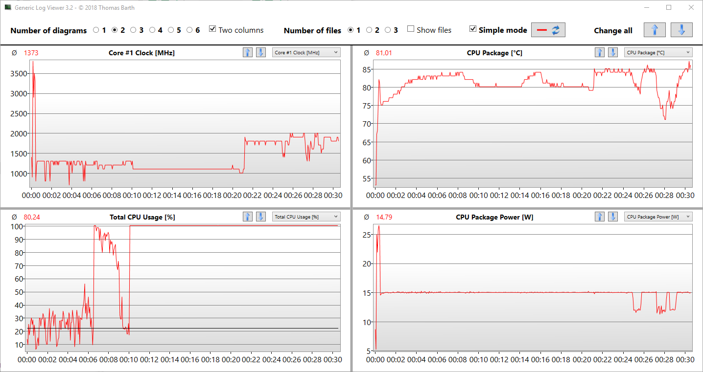 Unser R15-Logfile zeigt: Die Temperatur des CPU-Package bleibt mit knapp 85° im grünen Bereich während der Basis-Takt stets leicht überschritten bleibt.