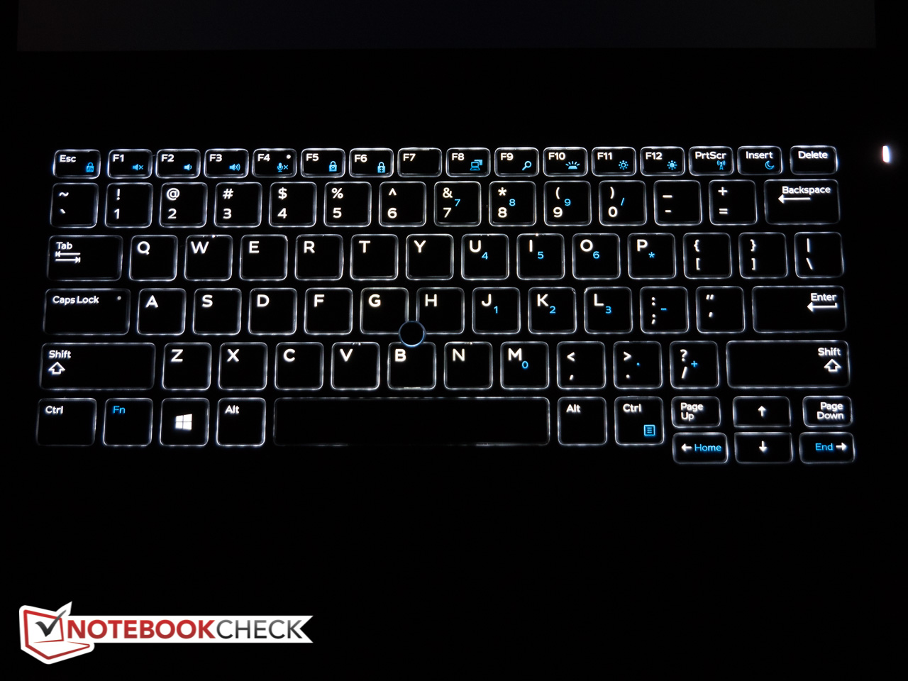 Die Chiclet-Tastatur mit dem wohlbekannten Dell-Layout scheint auf den ersten Blick identisch zu der des Latitude 5480, obwohl es in diesem Fall keinen Tastaturrahmen gibt. Stattdessen sind die Tasten direkt in die Oberfläche eingesetzt, was - zumindest theoretisch - höhere Stabilität bedeuten müsste. Diese ist in der Tat beachtlich, denn die Tastatur gibt selbst bei schwungvollem Tippen nie spürbar nach und fühlt sich sehr robust an. Die Rückmeldung der 14 mm großen, leicht konkaven Tasten ist exzellent, der Druckpunkt genau richtig und der Hub von etwa 2 mm eine - zumindest unserer persönlichen Meinung nach - willkommene Abwechslung zu den üblichen flachen Ultrabook-Tastaturen mit deutlich weniger Hub. Die von der Tastatur beim Tippen erzeugte Geräuschkulisse ist unaufdringlich und die zweistufige Tastaturbeleuchtung erleichtert das Tippen in dunklen Umgebungen erheblich. Für Vielschreiber ist diese Tastatur definitiv eines der besten am Markt erhältlichen Modelle.