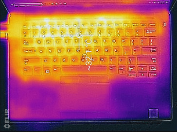Leider konzentriert sich ein Großteil der Hitze unter Last hinten auf die Mitte und auf der rechten Seite des Geräts (in aufgerichteter Position links), also dürfte es ziemlich schnell ungemütlich werden, falls man plant, das Notebook unter irgendeiner Form von erwähnenswerter Last auf dem Schoß zu benutzen.