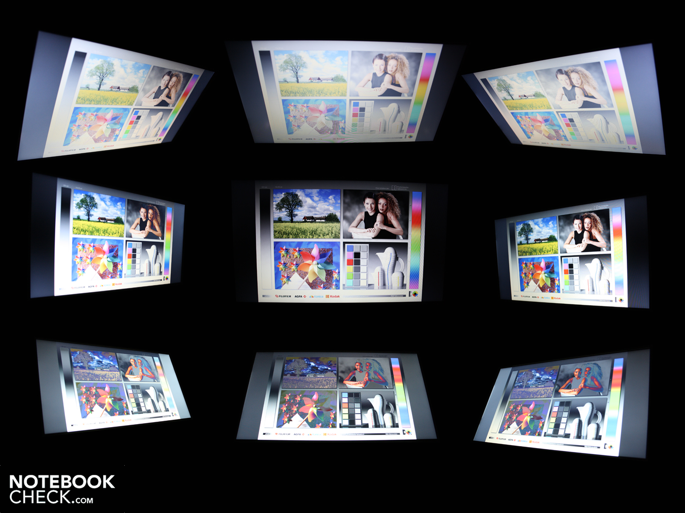 Bei den Blickwinkeln zeigt sich das Latitude sehr knapp. Weichen die Augen nach oben oder unten ab (vertikal), dann erscheinen bereits ab 20 Grad Geisterbilder. Nach rechts und links (horizontal) können wir nur bis zu 45 Grad von der Mitte abweichen. Darüber hinaus invertieren die Farben deutlich. Blickwinkelstabile Panels sind Mangelware, das Latitude E5420 gehört auch nicht zu der seltenen Rasse.