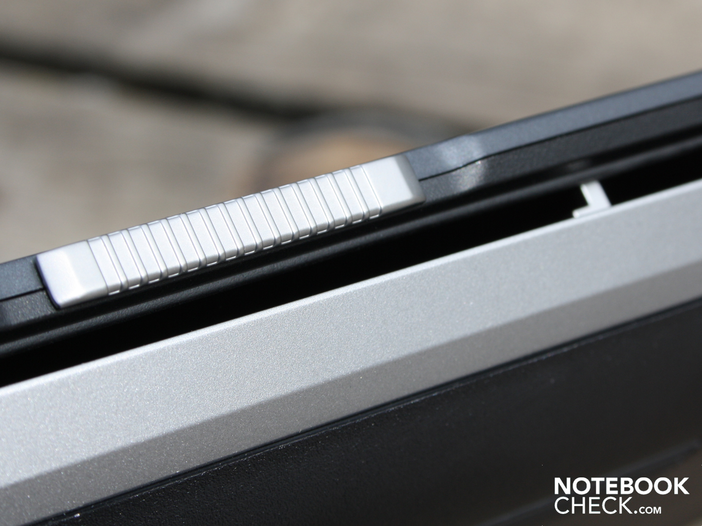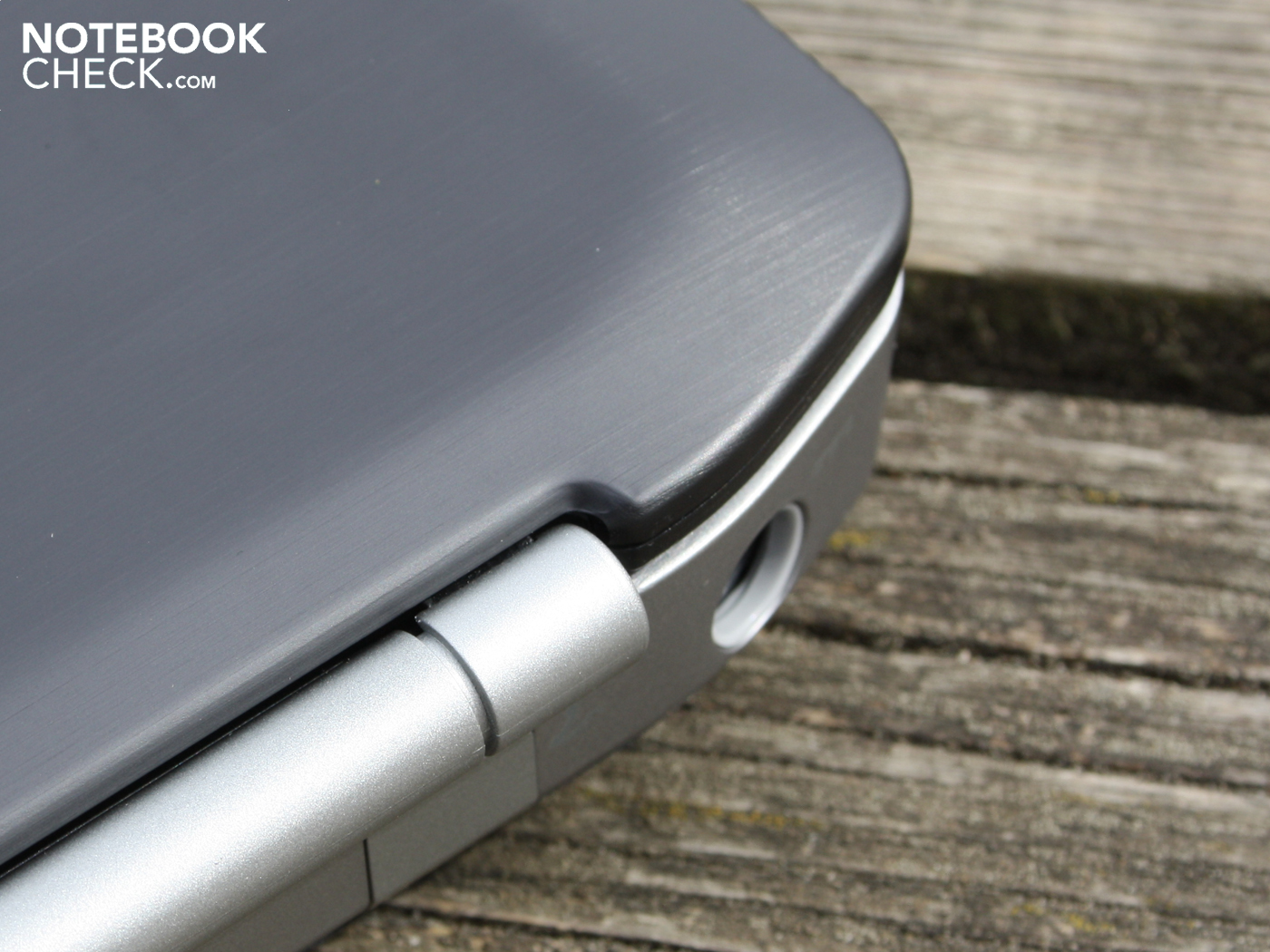 Die gewählten Materialien (Magnesium-Legierung, gebürstetes Aluminium) berühren sich kühl und sind kratzfest. Bei den Scharnieren setzt Dell auf Stahl, jedoch ist die silberne, sichtbare Leiste eine Abdeckung (nicht massiv). Die Gelenke sitzen fest an der Base Unit. Sie halten den Deckel straff und es kommt kaum zum Nachwippen. Auf Grund des hohen Gewichts der Base-Unit können wir das Display gerade so mit einer Hand nach oben ziehen. Der silberne Schieber gibt die Arretierung (zinklegiert) frei.