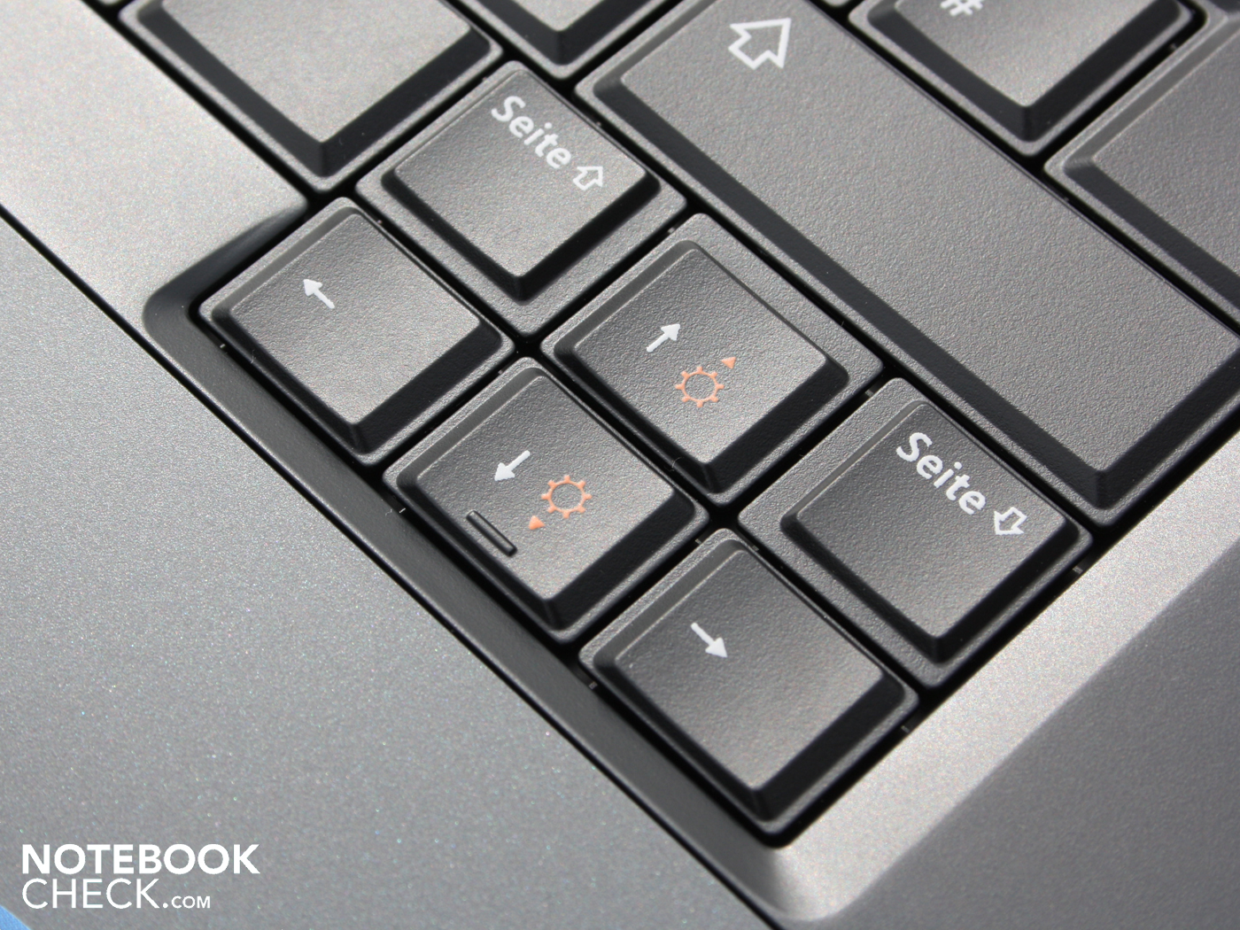 Die Tasten mit dem knackigen Druckpunkt und dem großen Tastenhub geben ein sehr gutes Feedback ab. Die abgesetzten Richtungstasten (+ Bild auf/ab) ragen aus dem Tasten-Rechteck heraus und lassen sich dadurch blind einfach bedienen. Ein Ziffernblock steht auf Grund des Formfaktors nicht zur Diskussion. Nutzer können dieser behelfsweise per Fn-Tasten hinzuschalten. Die entsprechenden Ziffern und Rechenzeichen sind in rot auf den Buchstabentasten markiert.
