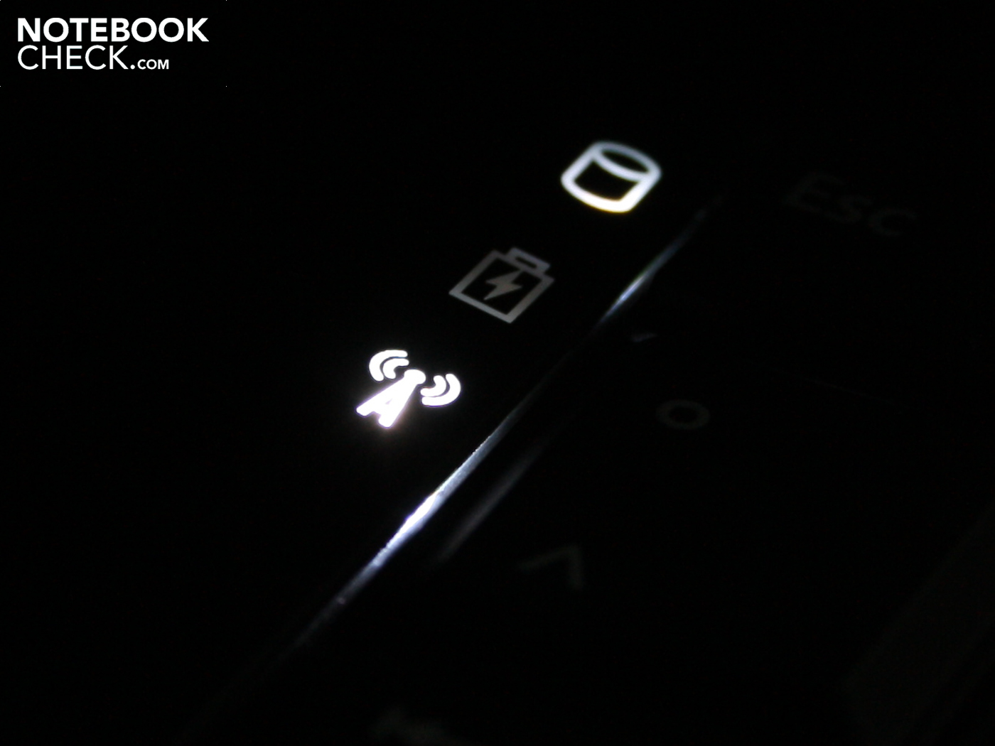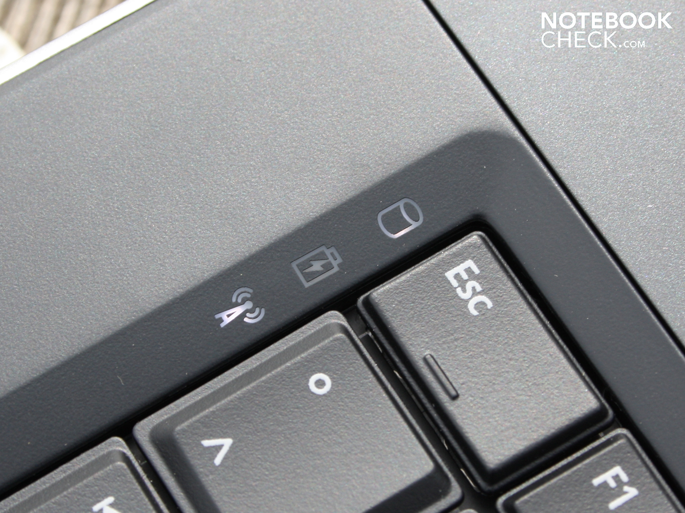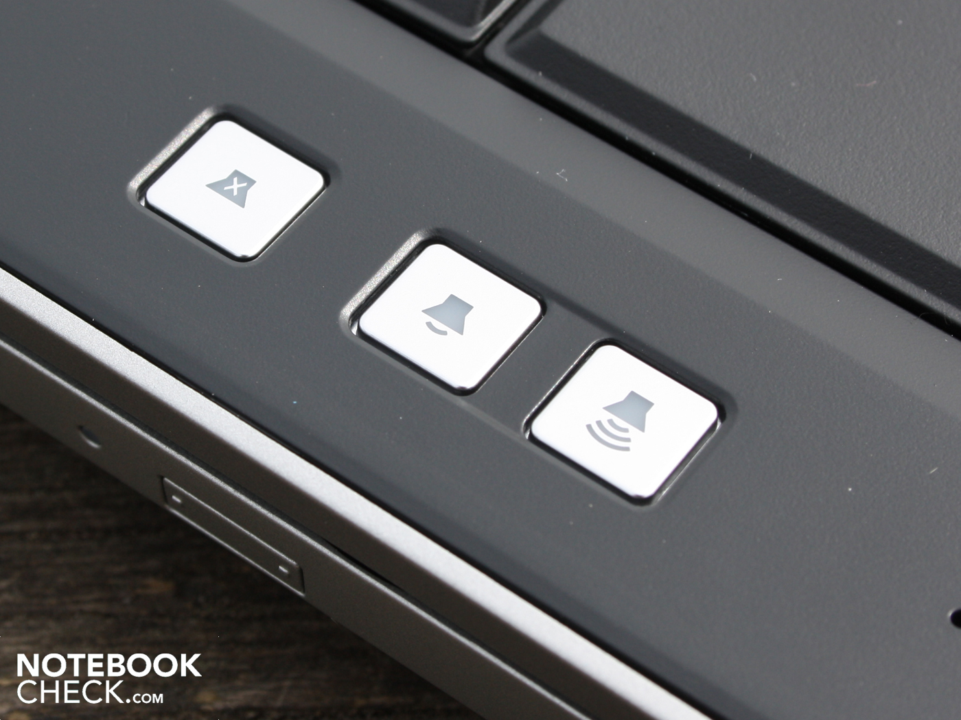 Den zwei Lautsprechern unter der Handballenauflage sind nur mittenbetonte Klänge zu entlocken. Tiefen fehlen vollständig. Für den geringen Maßstab eines Büro-Laptops kann sich das Klangbild aber hören lassen. Mit dem Höchst-Pegel kann ein kleiner Besprechungsraum beschallt werden und die kleinen Lautsprecher spielen weiterhin verzerrungsfrei ab. Löblich sind die Lautstärke-Tasten rechts neben der Tastatur. Falls der Chef das Büro betritt kann blitzschnell der Lautsprecher deaktiviert werden.