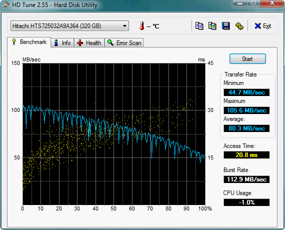 Wo der HDD-Score des PCMark Vantage eigenartig gering ausfällt, da spielt auch HD Tune verrückt (mehrfache Ausführung). Die 320 GB Festplatte aus dem Hause Western Digital schafft einen Datendurchsatz beim Lesen von lediglich 28.5 MB/s. Der Crystal Disk Mark hingegen meint, 98 MB/s (Lesen) wären korrekt.