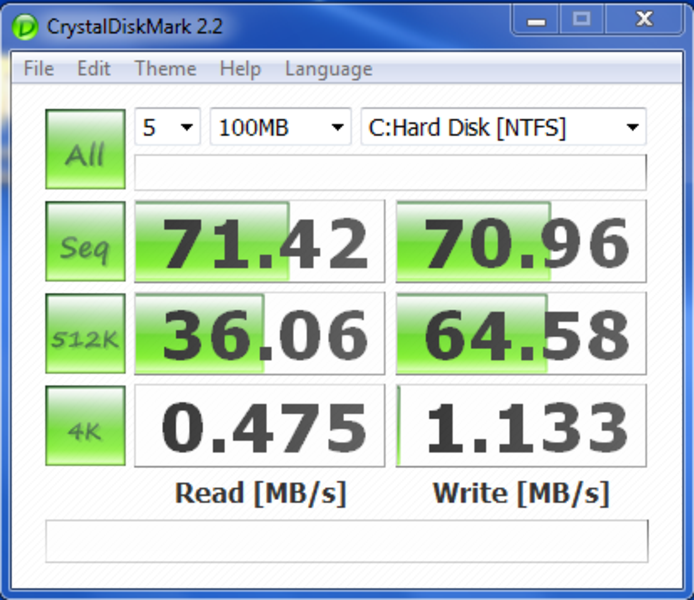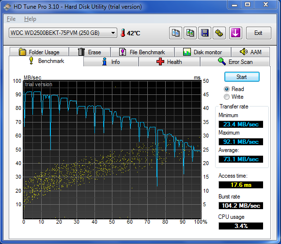 In unserem Testmuster des Dell Latitude E5520 kommt eine 2,5-Zoll-Festplatte von Western Digital zum Einsatz. Die WD2500BEKT-75PVMT0 verfügt über eine (Brutto-) Kapazität von 250 GB und eine Geschwindigkeit von 7.200 U/min. Mit einer durchschnittlichen Transferrate von 73.1 MB/s ist sie nicht übermäßig schnell ausgefallen. Lediglich die Zugriffszeit von 17.6 Millisekunden liegt leicht unter denen von Festplatten, die sich mit 5.400 U/min drehen.