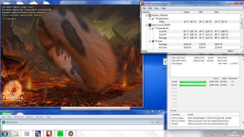 Den Volllastbetrieb simulieren wir mit den beiden Programmen Prime 95 und FurMark. So wird das Notebook an seine Belastungsgrenzen getrieben und das Kühlsystem voll ausgereizt. Die Temperaturen befinden sich alle im grünen Bereich. Der Prozessor erreicht laut dem CPUID Hardware-Monitor eine maximale Temperatur von 89 Grad Celsius. Ein Throttling des Prozessors konnte während des Belastungstests nicht festgestellt werden, und auch der anschließende 3D-Mark-06-Durchlauf lieferte keine Anzeichen auf einen Leistungseinbruch in irgendeiner Art und Weise.