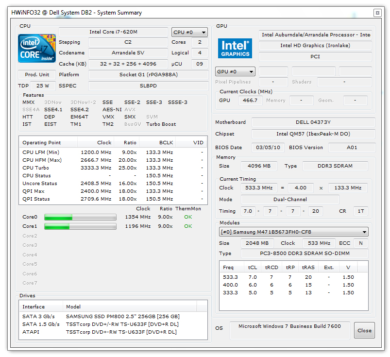 Wie eingangs bereits angesprochen, ist das Dell Latitude E6410 in einer Reihe an unterschiedlichen Konfigurationen verfügbar. Im Online-Konfigurator sind teils nicht alle möglichen Varianten verfügbar, deshalb muss man sich auch hier bei Bedarf ans Telefon hängen. Laut Datenblatt kann das E6410 mit Intel Core i5 und i7 Arrendale CPUs, also Dual-Core Chips, ausgestattet werden. Stärkste verfügbare CPU ist damit die i7-620M, die auch in unserem Testgerät zum Einsatz kommt.
