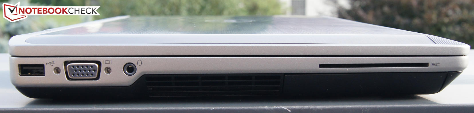 An der linken hinteren Ecke der Basis finden sich also, wie gehabt, der Netzteilanschluss, der RJ-45-LAN-Port, sowie ein Powered-USB-2.0-Anschluss (fürs Aufladen von Smartphones bei inaktivem Laptop), ein VGA-Ausgang für den Anschluss von alten Monitoren und Beamern, sowie ein Headset-Anschluss (kombiniert Kopfhörer und Mikrofonanschluss). Zusätzlich findet auf der vorderen linken Kante ein Smartcard Reader Platz.