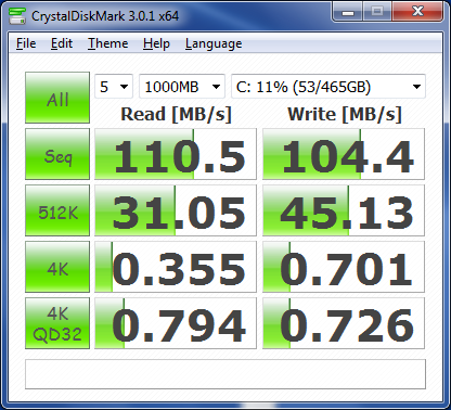 HDTune bestätigt die gefühlte Performance. Denn mit durchschnittlich 93,7 MB/s schauftelt dieser Massenspeicher relativ schnell die geforderten Daten weg - gemessen an der Tatsache, dass wir hier keinen schnellen Flash-Speicher vor uns haben, wie dieser in SSDs verbaut wird. Dieser Messwert ist als gut zu interpretieren, nur die Festplatte des Thinkpad T430 ist hier mit 99 MB/s etwas schneller. Die Festplatte im Elitebook 8460p transferiert Daten sogar im Schnitt um etwa ein Fünftel langsamer.