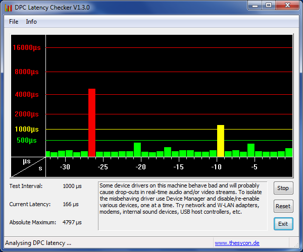 Im Cinebench R11.5 (64Bit, single) testen wir vorerst, wie gut der Turbo Boost die Prozessoren beschleunigt, oder ob es gar Probleme mit Throttling, also dem (temperaturbedingten) Ausbremsen dieser gibt. Das Latitude E6430 glänzt in diesem Test: Der 15. Gesamtrang aller getesteten Geräte zum Testzeitpunkt zeigt, dass das Business-Gerät Prozesse, die nur einen Kern benötigen, ordentlich beschleunigt. HWInfo zeigt, wie im Screenshot rechts zu sehen, dass der Turbo effizient und vor allem permanent arbeitet. Schon bei der langsamsten gemessenen Geschwindigkeit (siehe Screenshot rechts) wirkt ein Kern, wie auf der maximalen Frequenz (3,3 GHz) festgenagelt. Die meiste Zeit verbleiben allerdings beide Kerne auf über 3 GHz.