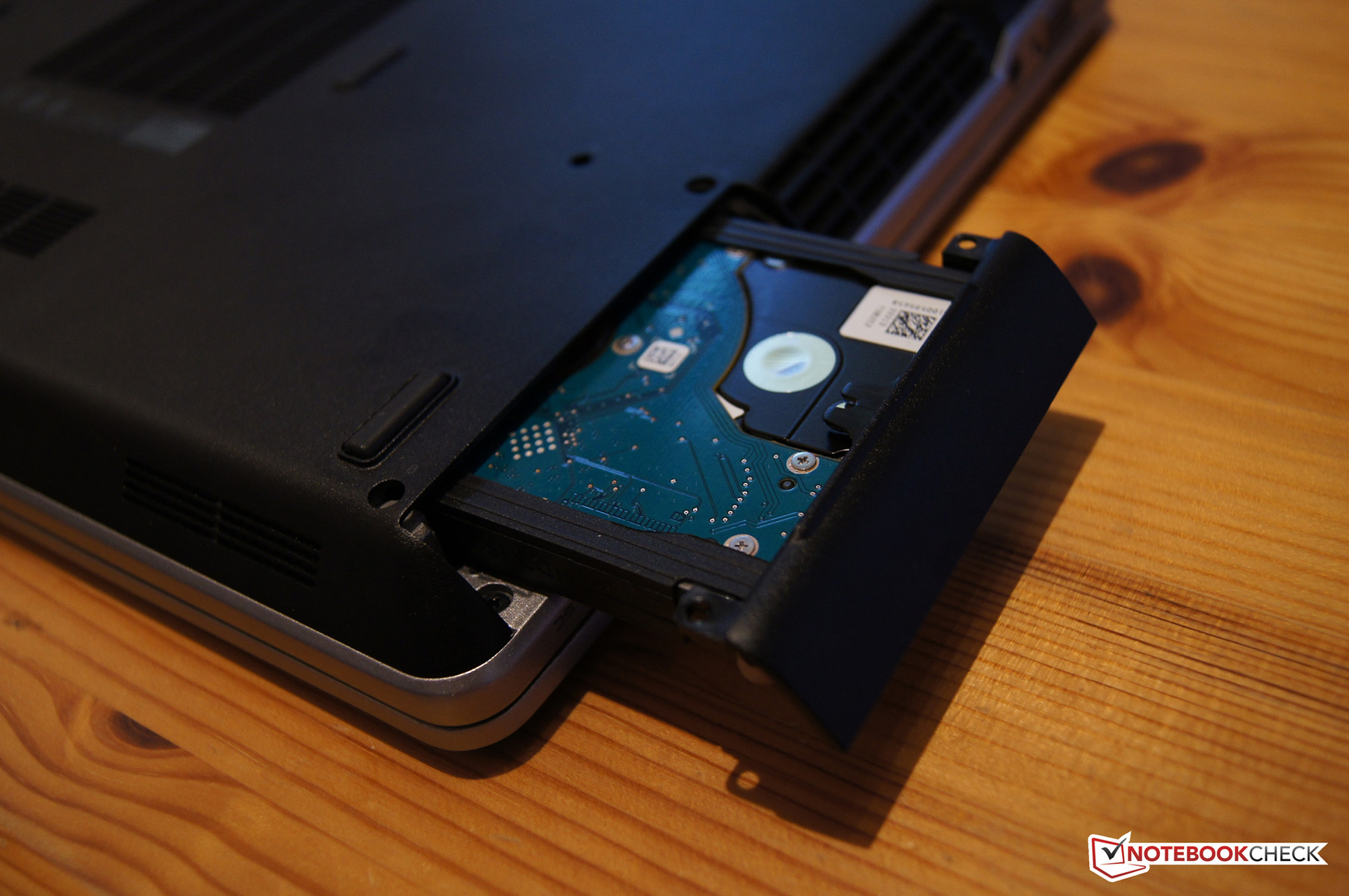 Sehr einfach gestaltet sich das Austauschen des optischen Laufwerks oder der Festplatte: Beide Bauteile finden sich (je links/rechts an der Unterseite des Gehäuses) in Schächten verbaut, die einfach von außen zugänglich sind. Das DVD-Laufwerk kann mittels ausfahrbarer Arretierung einfach herausgezogen werden, um es beispielsweise gegen diverses Zubehör von Dell zu tauschen. Zum Herausziehen aus dem Schacht und Tauschen der Festplatte löst man zwei Kreuzschrauben. Weitere fünf müssen nun noch gelöst werden, dann ist die stabile Magnesiumbodenplatte geöffnet und präsentiert den Blick auf die restliche Hardware. Hier kann z. B. der Arbeitsspeicher getauscht- oder erweitert werden (bei unserem Modell ist ein Slot frei).