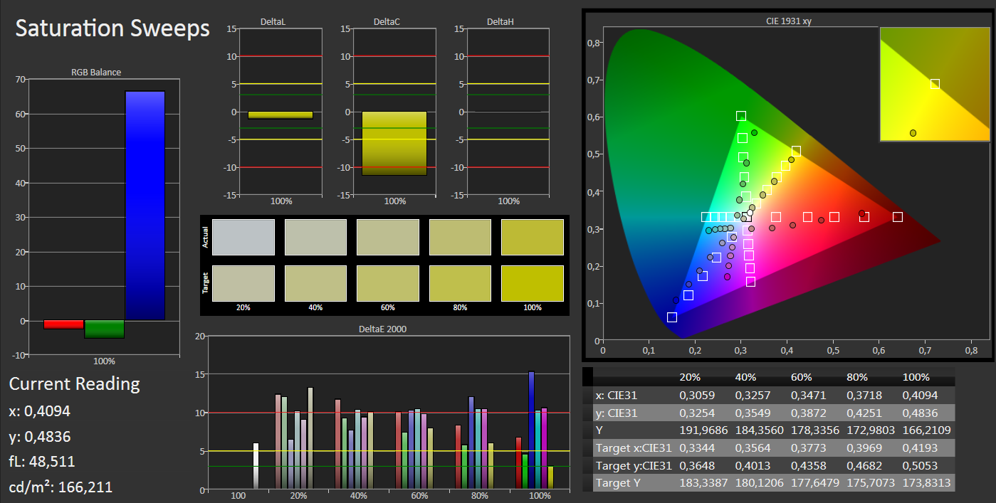 Zur weiteren Farbanalyse verwenden wir die Software CalMan und ein Kolorimeter. Auch hier fallen die Werte recht ernüchternd aus: Bei der Farbgenauigkeit bleibt kein einziger der Farbbalken unter der grünen Linie, also unter einer Abweichung von 3. Die durchschnittliche Abweichung DeltaE2000 ist mit 8,19 recht hoch. Die Graustufen zeigen ebenfalls hohe Abweichungen vom Idealwert des Refernzfarbraums und einen starken Blaustich. Damit deutet sich schon an, was sich im Sättigungsbildschirm bestätigt: Blau ist stark überbetont. Das MacBook Pro 13 zeigt, wie es besser geht: Bereits im Werkszustand bietet es äußerst geringe Abweichungen von den Idealwerten.