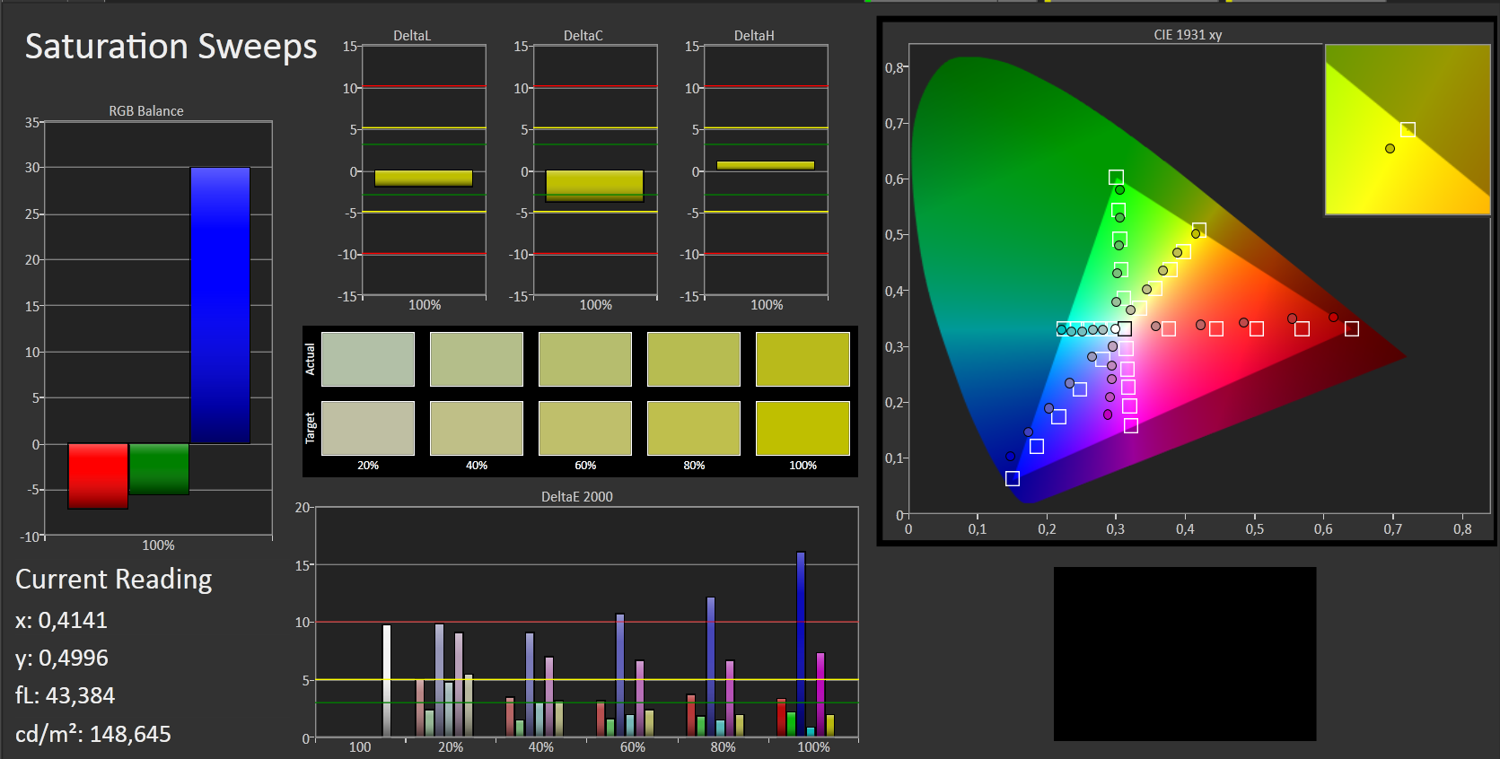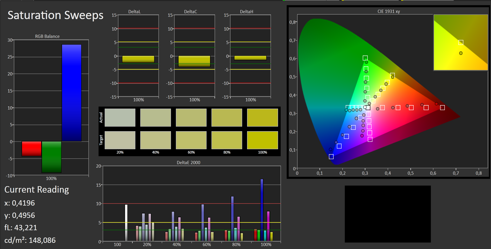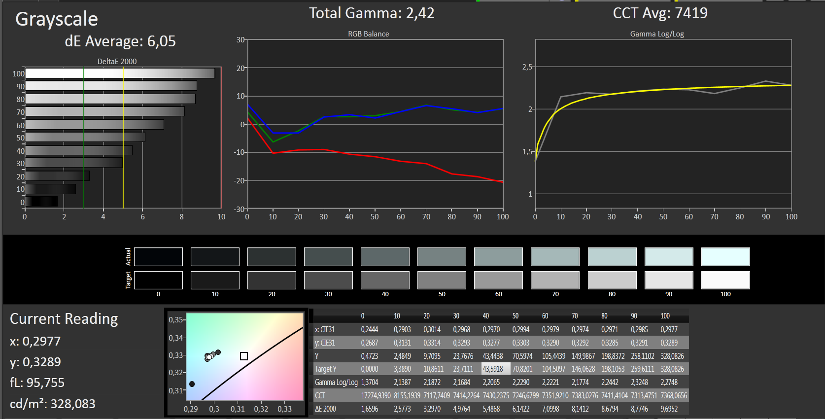 Schaut man sich die Messungen mit dem Kolorimeter an, sieht man teilweise stärkere Abweichungen bei den Graustufen wie auch bei der Farbdarstellung. Das Panel hat einen leichten erkennbaren Blaustich. Positiv fällt aber auf, dass nur bei Magenta eine sichtbare Farbabweichung von etwa DeltaE 7 vorliegt. Auch eine Kalibrierung kann nur noch wenig verbessern.