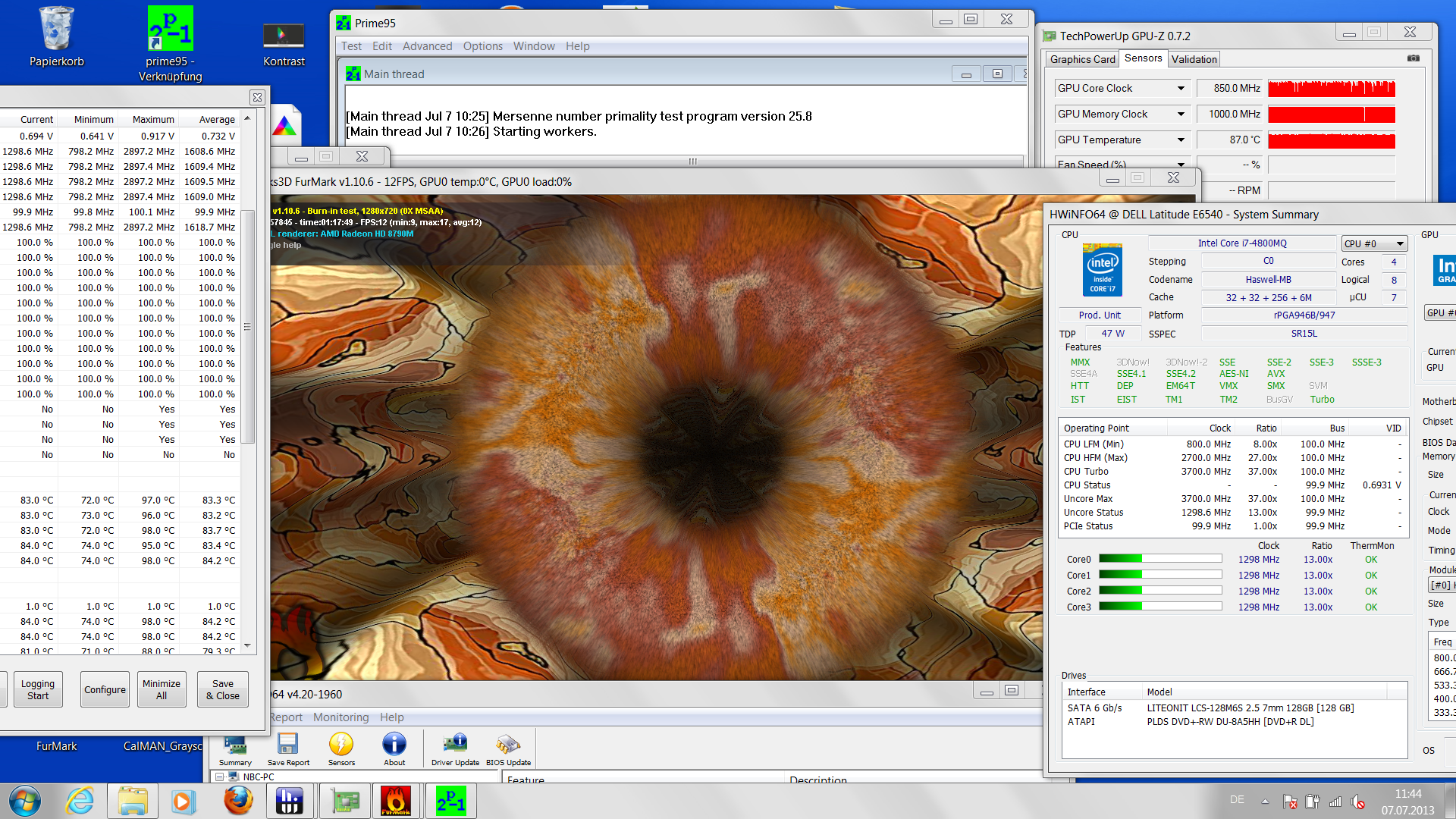 Bei unserem Stresstest werden Prozessor und Grafikkarte über eine Stunde voll ausgelastet. Hier wird dann das Kühlsystem gefordert und muss zeigen, ob es ausreichend dimensioniert ist. Die Grafikleistung bleibt dabei über den gesamten Zeitraum recht konstant. Der Kerntakt schwankt zwischen 850 und 900 MHz. Die Temperatur hält sich gleichbleibend bei 87 °C.