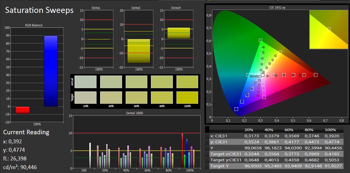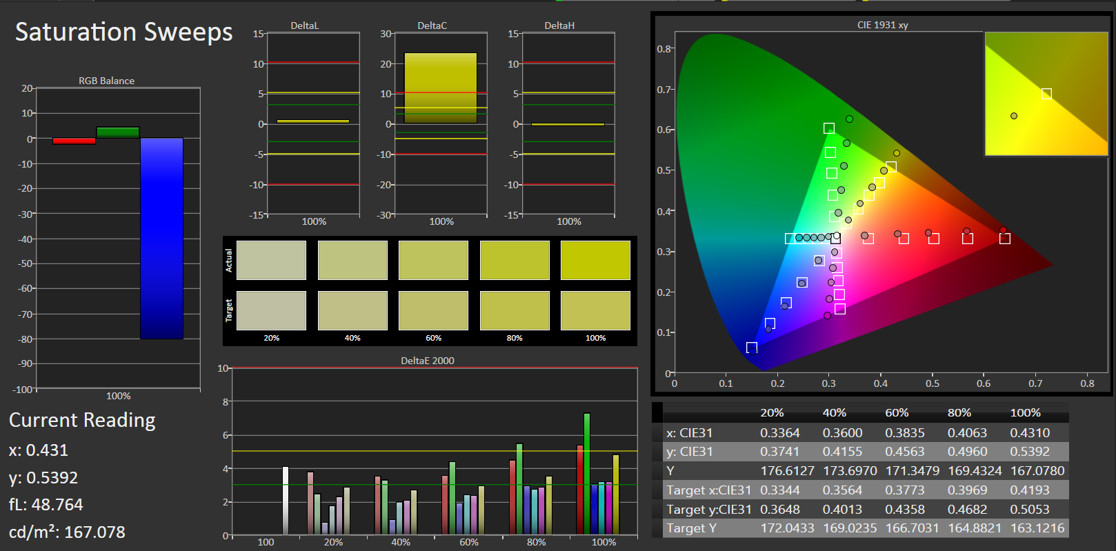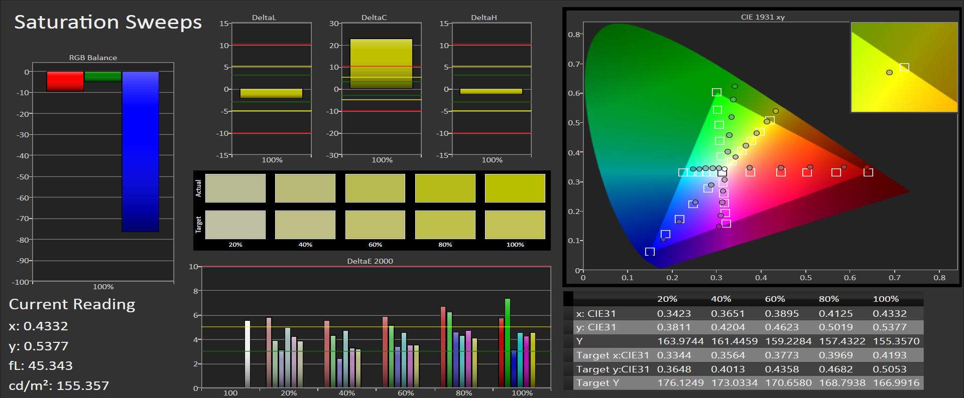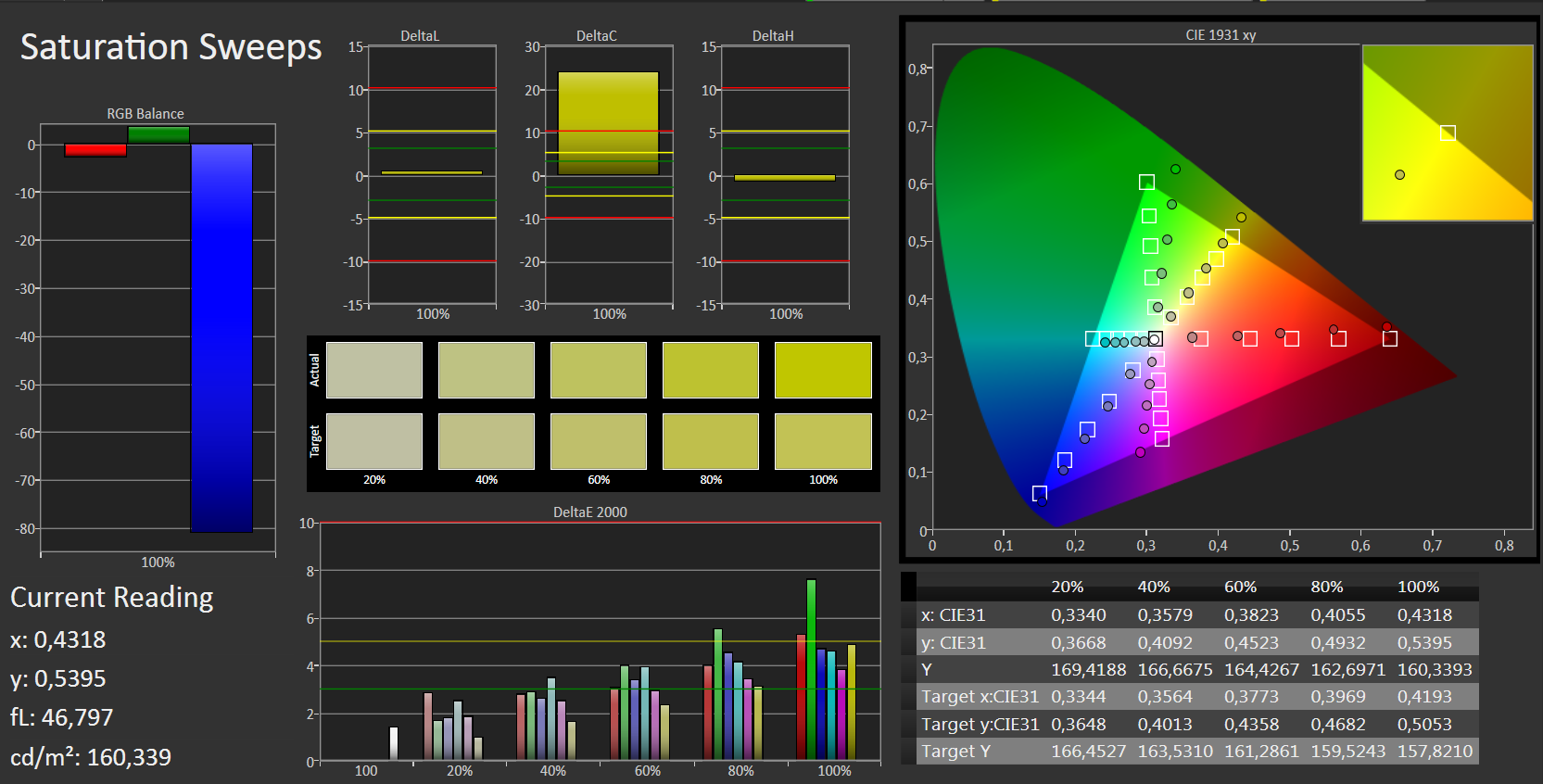 Auch in puncto Farbwiedergabe bekleckert sich die Anzeige nicht gerade mit Ruhm. Ohne vorherige Kalibrierung messen wir über das gesamte Spektrum starke Farbabweichungen, die in einem sehr hohen Delta E von 12,8 deutlich werden. Optimal eingestellt lässt sich dieser Kennwert auf 4,8 reduzieren, wobei selbst dann noch ein leichter Blaustich zurückbleibt. Hinzu kommt der eingeschränkte Farbumfang, der wichtige Standards wie sRGB und AdobeRGB klar verfehlt – für professionelle Fotografen und Grafiker ein KO-Kriterium.