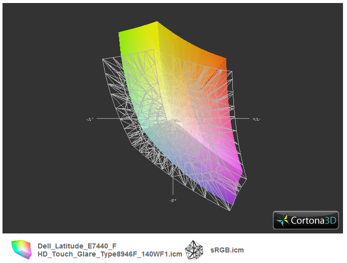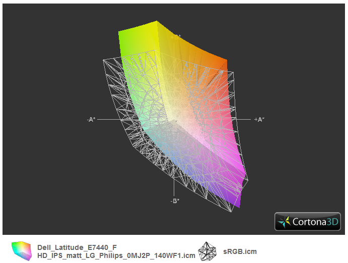 Um die optimale Bildqualität des Displays genießen zu können, sollte sich der Anwender möglichst mittig vor diesem platzieren. Auf schräge Blickwinkel, insbesondere von oben oder unten, reagiert die Anzeige ähnlich allergisch wie die meisten anderen TN-basierten Fabrikate. Trotz des seitlich etwas größeren Bewegungsspielraumes richtet sich das E7440 damit klar an Einzelnutzer; gemeinschaftliche Filmabende dürften aber ohnehin nicht zum bevorzugten Einsatzgebiet des Latitude zählen.