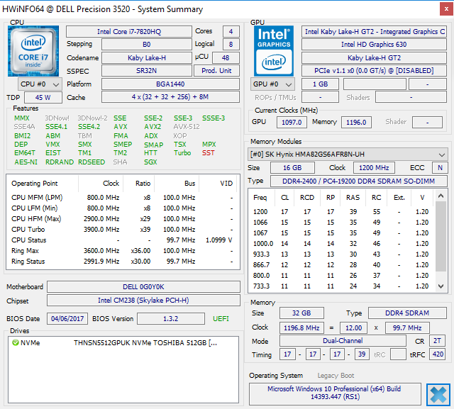 Test Dell Precision 3520 (i7-7820HQ, M620M) Workstation