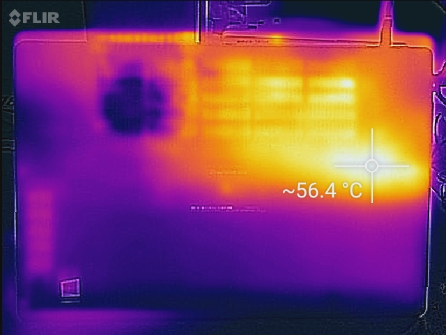 (-) Auf der Unterseite messen wir eine maximalen Wert von 56.4 °C (im Vergleich zum Durchschnitt von 41.1 °C).