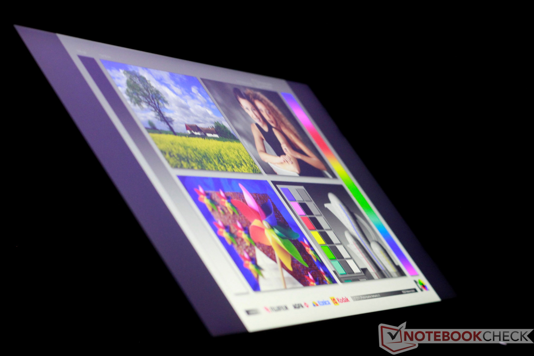 Im Freien ist die Verwendung dieser Workstation aufgrund der geringen Helligkeit etwas schwierig. Während im Schatten noch etwas abgelesen werden kann, ist der Bildschirm bei direkter Sonneneinstrahlung so gut wie nutzlos. Wir würden auch Fensterplätze vermeiden. Die Blickwinkel sind allerdings gut; Farben werden auch bei weiteren Blickwinkeln scharf und korrekt dargestellt. Nur ab einem Einblickswinkel von 60° verliert das Bild etwas an Helligkeit. Das Display hat nur sehr wenig Backlight Bleeding, welches hauptsächlich in der unteren rechten Ecke auftritt. Die matte Oberfläche wirkt auf weißem Hintergrund etwas körnig. Dies fällt aber nur auf, wenn man sehr nahe am Bildschirm sitzt (ab etwa 20 cm Entfernung).