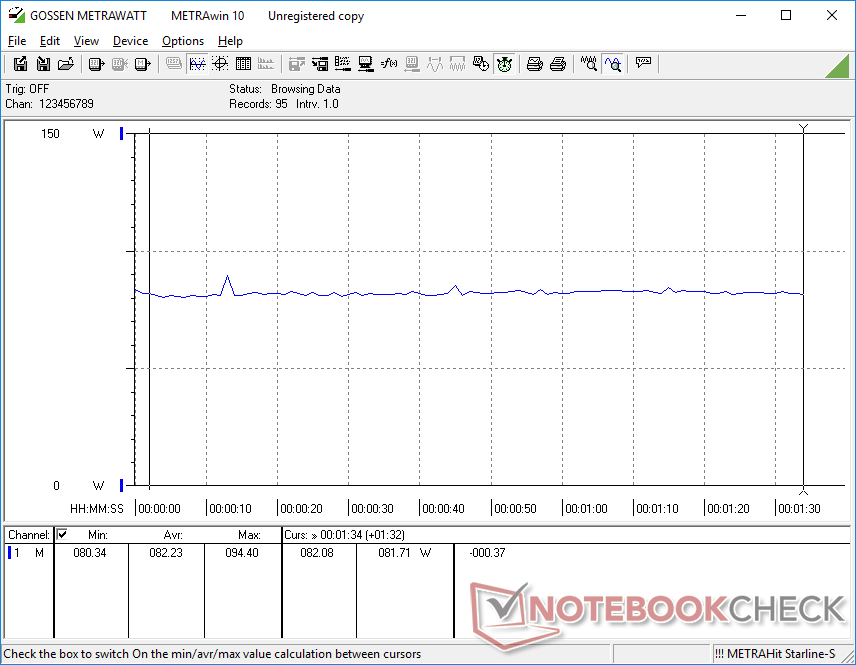 Wir konnten bei synthetischer Last mit Prime95 und FurMark eine kurzzeitige Spitze von 136 W messen, die durch das mittelgroße (ca. 14,3 x 6,5 x 2,2 cm) 130-W-Netzteil flossen. Wie den Graphen unten zu entnehmen ist, sank dieser Wert nach wenigen Sekunden allerdings auf nur noch 94 W. Anders ausgedrückt: Unser Testsystem war nicht in der Lage, seinen maximalen Turbo-Boost über längere Zeit zu erhalten. Diese Beobachtung entspricht auch unseren Messergebnissen im Cinebench-R15-Loop.