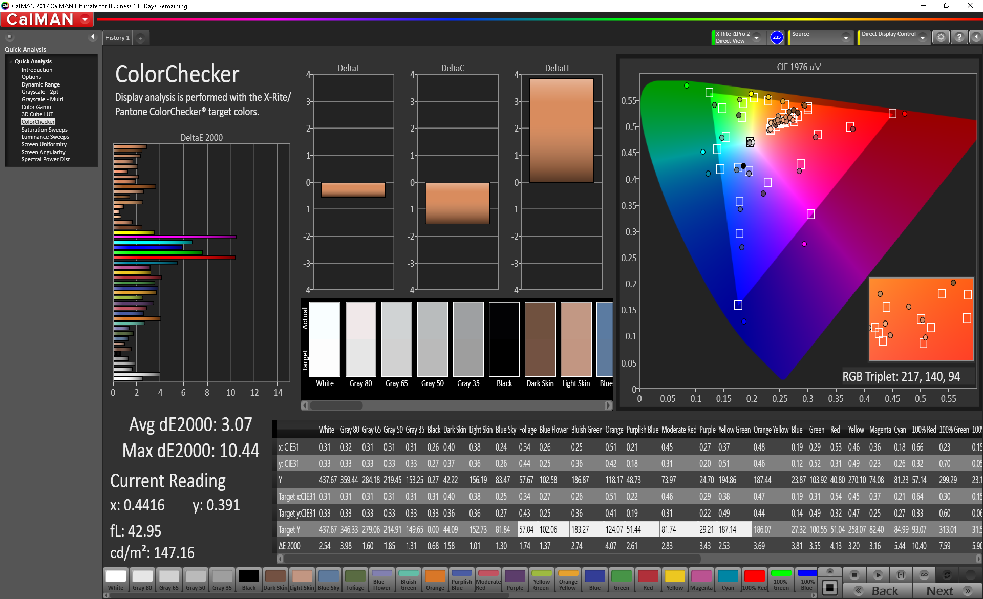 | Delta E Colorchecker * | 3.11 | 2.6 16% | 3.51 -13% | 5.84 -88% | 4.5 -45% | 2.7 13% | 5.5 -77% | 1.2 61% |