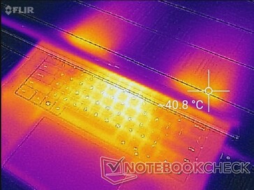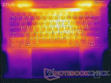 Die Oberflächentemperaturen waren insgesamt symmetrisch, der Hot Spot in der Mitte der Tastatur erwärmte sich bei hoher Last auf über 47 °C. Insgesamt blieb das Gerät kühler als das Acer ConceptD 3 Pro, bei dem sich die Tastatur auf über 53 °C erwärmte.