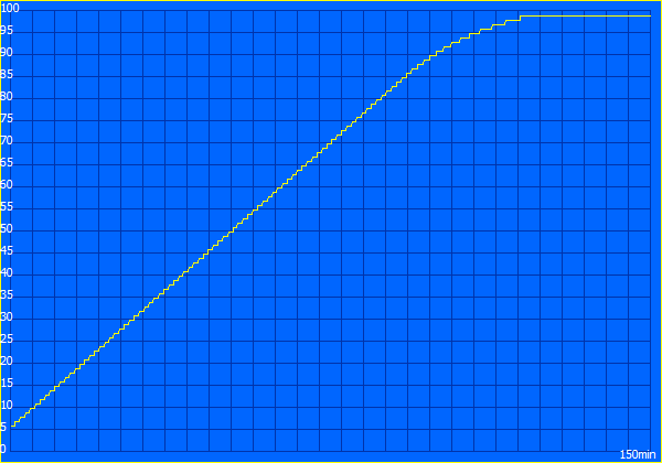 In den Tests mit einer angepassten Helligkeit von 150 cd/m² ermitteln wir jeweils mehr als 6 Stunden (WLAN und Video). Im Anschluss ist der Akku auch recht schnell wieder aufgeladen. Eine vollständige Aufladung benötigt zwar 2,5 Stunden, doch nach 30 Minuten stehen bereits 30 % und nach 50 Minuten 50 % der Kapazität wieder zur Verfügung.