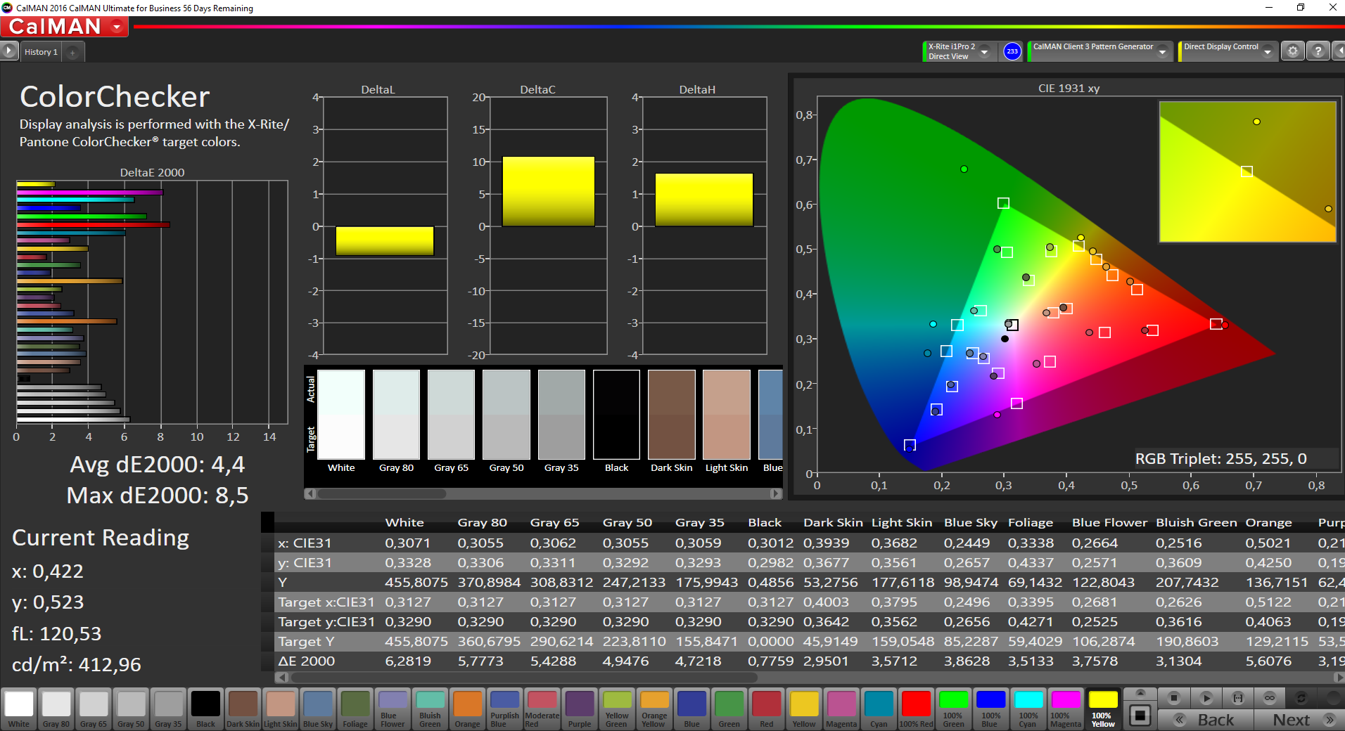 Mit unserem X-Rite i1 Pro 2 Spektralfotometer haben wir das PremierColor-Display kalibriert. Die entsprechende ICC-Datei steht weiter oben in der Display-Box zum Download bereit (wie installiere ich ein Farbprofil). Besonders die Graustufendarstellung können wir damit deutlich verbessern. Das gilt auch für die Farben, wobei es mit Rot und Blau weiterhin zwei Ausreißer gibt.