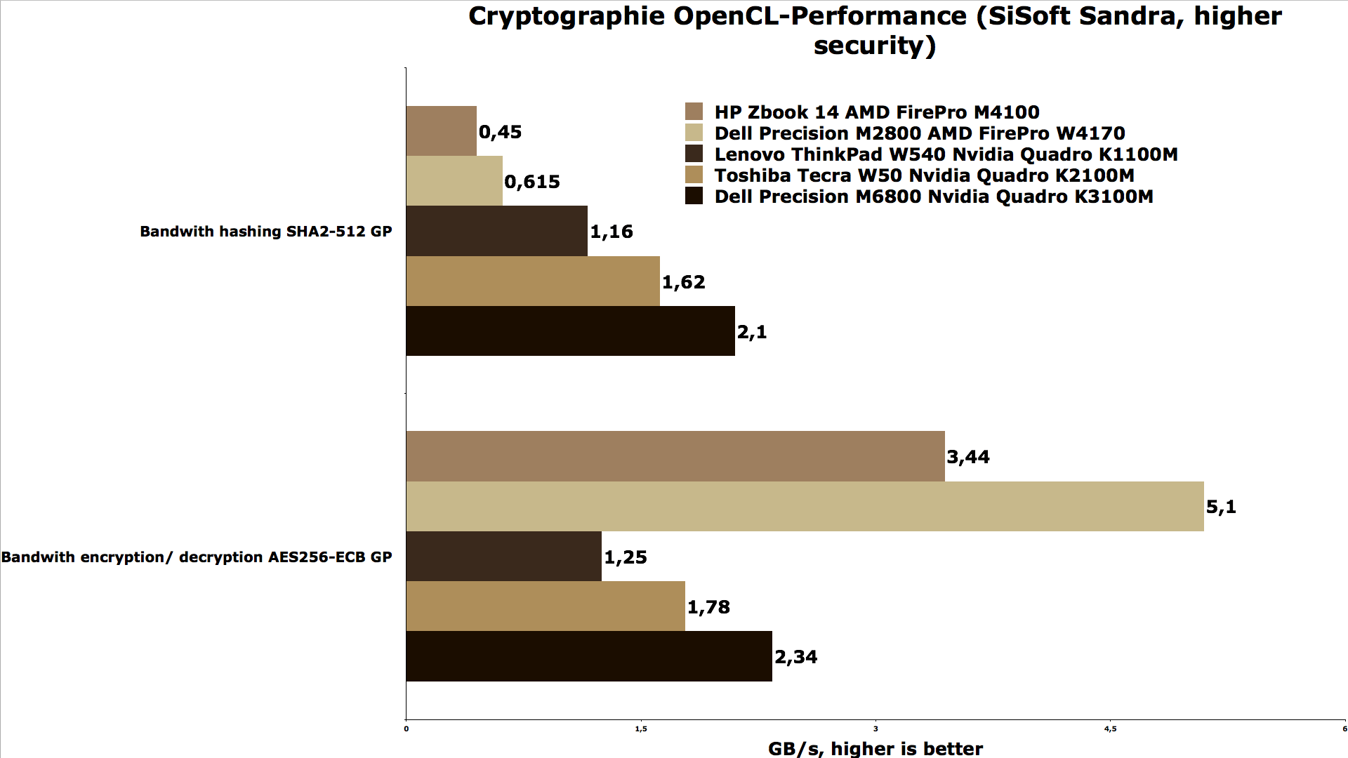 Obwohl es sich bei der AMD FirePro W4170M eher um eine Einstiegslösung handelt, kann sie sich in weiten Teilen unserer OpenCL Tests an die Spitze setzen. Lediglich bei einigen Finanzaufgaben wird sie knapp von Nvidias Quadro K3100M geschlagen und beim Hashing im Kryptographiebereich reiht sie sich zwischen AMD FirePro M4100 und Nvidia Quadro K1100M ein.