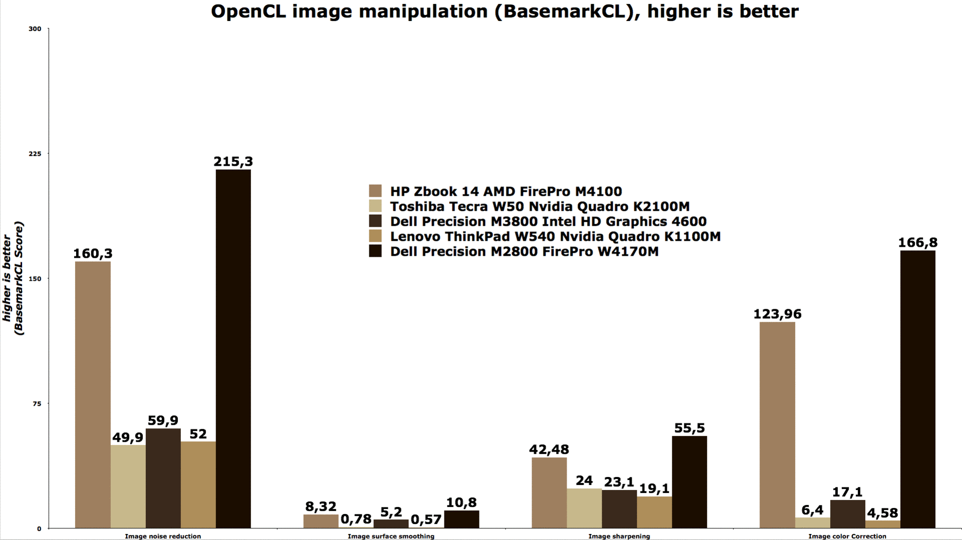 Eine regelrechte Dominanz zeigt AMDs FirePro W4170M bei rechenintensiven Licht-Schatten-Berechnungen (Raytracing). Beim Benchmark Luxmark 2.0, den wir nur mit der jeweiligen OpenCL GPU ausführen, wird die Konkurrenz regelrecht deklassiert.