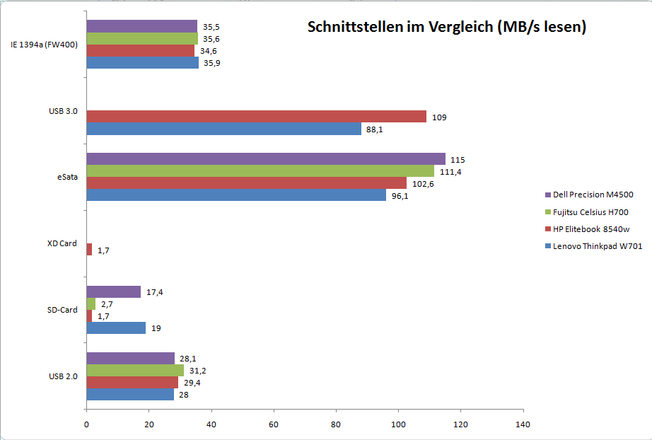 Auch wundern wir uns über das Fehlen der USB 3.0 Schnittstelle, die bei einer Workstation eigentlich dazugehören sollte. Per ExpressCard/34 könnte dieser fehlende Anschluss bei Bedarf aber problemlos ergänzt werden. Ansonsten bietet Dell mit dem 115 MB/s schnellen eSata eine gute Alternative und der immer seltener vorzufindende 4-polige FireWire-Port (IEEE 1394a) ist auch mit an Bord (35,5 MB/s). Nicht so flott arbeitet USB 2.0 mit max. 28,1 MB/s und ist daher eher die erste Wahl für Drucker, Digicams usw. Nicht fehlen dürfen natürlich ein analoger VGA-Ausgang, für ältere Monitore und Beamer, und ein digitaler Bildausgang in Form des Displayports für optimale Signalqualität. Der VGA Ausgang bietet bei Auflösungen von 1280x1024 ein noch gutes Bild, bei 1680x1080 wird die Darstellung schon sichtbar unscharf. Die ins Gehäuse eingebettete Bauform des VGA-Anschlusses könnte allerdings zu Problemen mit manchem breiter ausgeführten VGA-Kabel führen.