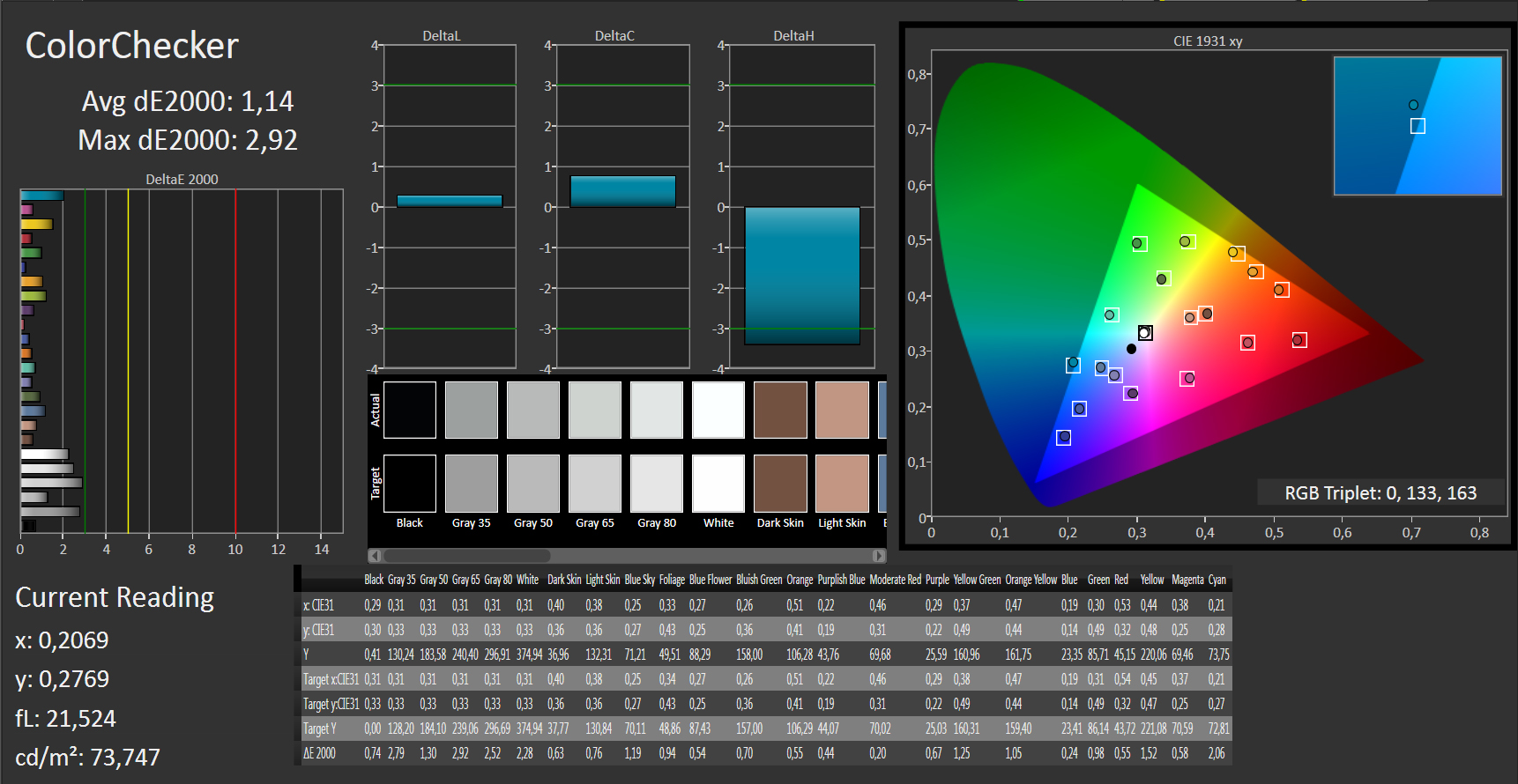 Die werkseitige Abstimmung des Bildschirms ist deutlich besser einzustufen, als man das sonst von Notebookdisplays her gewohnt ist. Der Gammawert hangelt sich relativ genau an der Idealkurve entlang und auch die sonstigen Messergebnisse liefern mit einem durchschnittlichen DeltaE2000 von 5,73 (Graustufen) und 3,89 (Mischfarben) ein erstaunlich gutes Resultat ab. Dennoch werden professionelle Anwender auch mit Dells QHD+-Display nicht "out of the box" arbeiten, da die Abweichungen in Einzelfällen mit einem DeltaE2000 von über 10 im deutlich sichtbaren Bereich liegen. Nach dem Kalibrieren sind diese Ausreißer verschwunden und man hat tatsächlich ein wirklich brauchbares Display vor sich. Neben hervorragenden DeltaE2000-Werten bei der Farbgenauigkeit und den Graustufen liefern natürlich auch die RGB-Balance und die Gammakurve ein hohes Maß an Übereinstimmung.