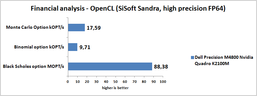 Wenn Aufträge anstatt von der CPU durch eine Grafikeinheit bewältigt werden können (GPGPU), dann hat man in der Regel neben einer deutlich geringeren Systemlast auch spürbar schneller die Ergebnisse vorliegen. Beim Dell Precision M4800 beleuchten wir die Leistungsfähigkeit der plattformunabhängigen und offenen OpenCL-Schnittstelle und Nvidias hauseigener CUDA-Engine. Intels Quick Sync Video kann nicht genutzt werden, da die integrierte Intel HD Graphics 4600 nicht aktiviert ist. Wir haben in den Tests die Bereiche Video- und Bildbearbeitung, Finanzmathematik, Verschlüsselung, Raytracing und Videokonvertierung berücksichtigt. Einige der Aufgaben haben wir neu ins Repertoire aufgenommen und stehen derzeit noch ohne Vergleichswerte da. Sobald Ergebnisse anderer Workstations vorliegen, ergänzen wir die Grafiken mit den konkurrierenden Profigrafikchips.