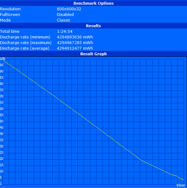 Der laufzeittechnische Supergau, der sich durch die hohen Verbrauchswerte zunächst einmal ankündigt, wird durch den kapazitätsstarken 97-Wh-Akku erfolgreich verhindert. Beim Battery Eater Readers Test (minimale Helligkeit, Funk aus, maximale Energiesparoptionen) gehen daher erst nach 318 Minuten die Lichter aus. Praxisgerechtere Anhaltspunkte erhält man beim WLAN-Test. Mit ziemlich genau 3 Stunden Akkulaufzeit (Helligkeitsstufe 6, Energiesparprofil, Funk an) kann man zumindest in diesem Szenario eine Zeit lang ohne Steckdose auskommen. Ähnlich lang ist es möglich bei Displaystufe 8 und ausgeschalteten Funkmodulen DVDs anzuschauen. Unter Volllast nimmt die Laufzeit, trotz reduzierter Leistungsfähigkeit von 20 bis 30 %, rapide ab und reicht dann noch für knapp 1:30 Stunden Arbeitszeit.