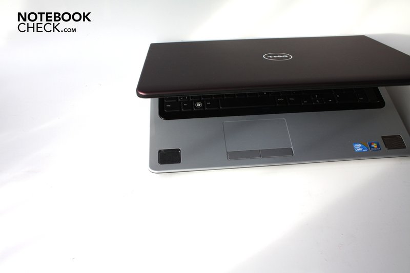 Innen sehen alle Studio 17-Notebooks ähnlich aus: Glänzend schwarzer Kunststoff rund um den Bildschirm, oben links der weiße Schriftzug "Studio" und mittig unten erneut ein metallisches Dell-Logo. Der schwarze Kunststoff führt weiter in eine Multimedialeiste oberhalb der Tastatur und bildet weiterhin einen schmalen Tastaturrahmen. Der Rest der Innenseite ist von hellgrauem Kunststoff bestimmt, der ebenfalls hochglänzend lackiert ist. Auffallend sind noch die beiden Lautsprecher, die links und rechts in die Handballenauflage eingelassen sind und durch ein perforiertes und verchromtes Metallgitter geschützt sind.