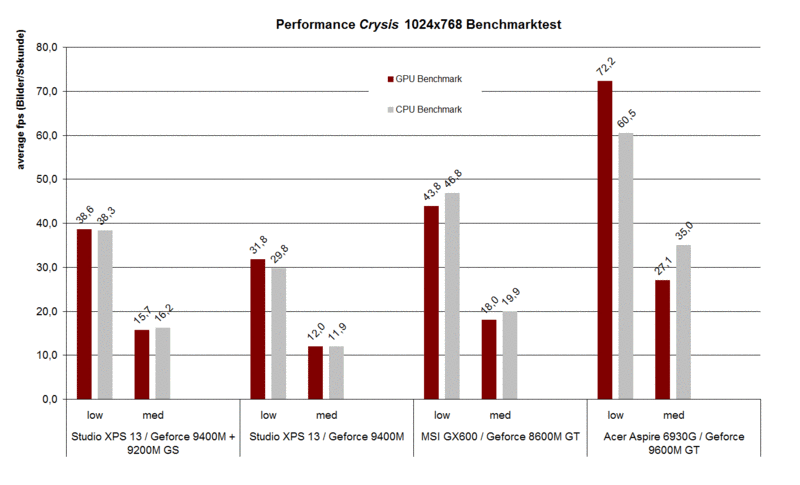 Als Vertreter der anspruchsvollen aktuellen Games wählten wir Crysis in der Auflösung 1024x768. Die Detailstufe High entfällt praktisch von vornherein, beißen sich doch hier selbst Gaming-Boliden wie etwa das M17 von Alienware die Zähne aus. Zumindest für Vergleichszwecke überaus interessant sind allerdings die Stufen Medium und Low.