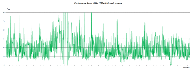 Der praktische Spieletest brachte aber auch bei diesen Einstellungen keine langfristigen Verbesserungen. Das Langzeit-Fps Protokoll zeigt konstant Einbrüche in den Bereich unter 15 Fps, was sich auch im Gameplay als Ruckler abzeichnete. Insgesamt war Anno auf diesen Einstellungen zwar problemlos spielbar, mit den kurzen Hängern mussten wir uns aber anfreunden. Kann bzw. will man das nicht, bleibt lediglich eine weitere Reduktion der Detailstufe bzw. der Auflösung zu Lasten der Grafikqualität. Tolle Effekte, wie etwa die Transparenz der toll animierten Wasseroberfläche, gehen dann leider auch verloren.