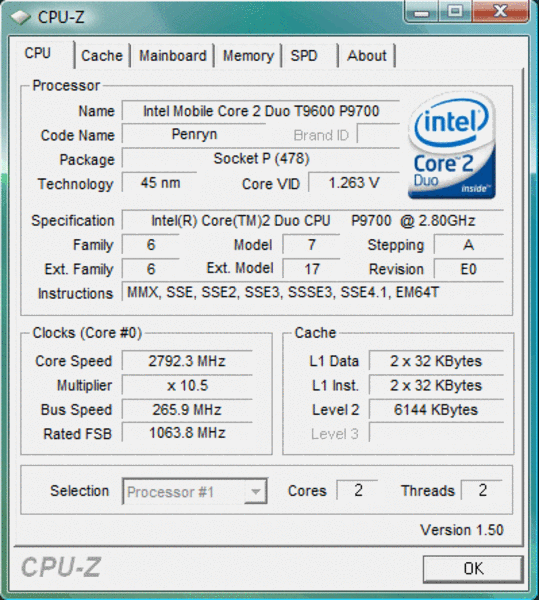 In unserem Testgerät befand sich mit der Intel Core 2 Duo P9700 ein leistungsstarker Zweikernchip der aktuellen Penryn Generation. Mit einer Taktrate von 2.8 GHz zählt der Chip zu den schnellsten aktuell verfügbaren Dual-Core Prozessoren. Lediglich der T9800, der T9900 sowie der X9100 sind hinsichtlich Performance über der P9700 zu reihen. Als Vertreter der Pxxx Bauart, kann der Chip außerdem durch einen niedrigeren TDP-Wert (Thermal Design Power) überzeugen. Mit 28W liegt dieser unter den 35W der Prozessoren der Txxx Reihe. Was die Kühllast betrifft, hat unser Testsample damit einen minimalen Bonus gegenüber Konfigurationen mit Txxx Chips, wie etwa dem T9800.