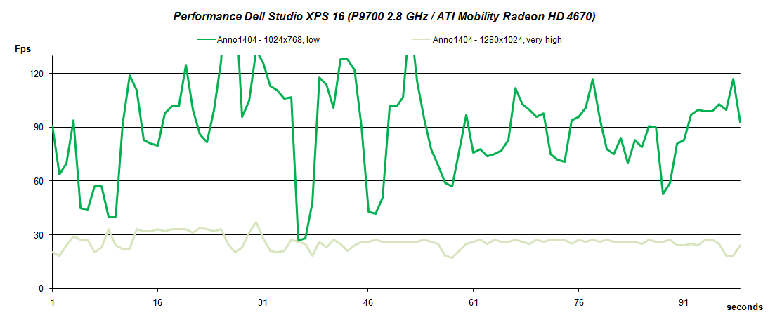 Fazit: Grundsätzlich gehört die ATI Mobility Radeon HD4670 zu den leistungsstarken Multimedia Grafikkarten. Im praktischen Test bei diversen Games konnte sie aber im Einsatz im Dell Studio XPS 16 nicht ganz überzeugen. Dies lag vor allem an den beobachtbaren wiederholten kurzen Performance Einbrüchen, die teils auch schon im Acer Aspire 8935G mit identer Grafikhardware beobachtet werden konnte.