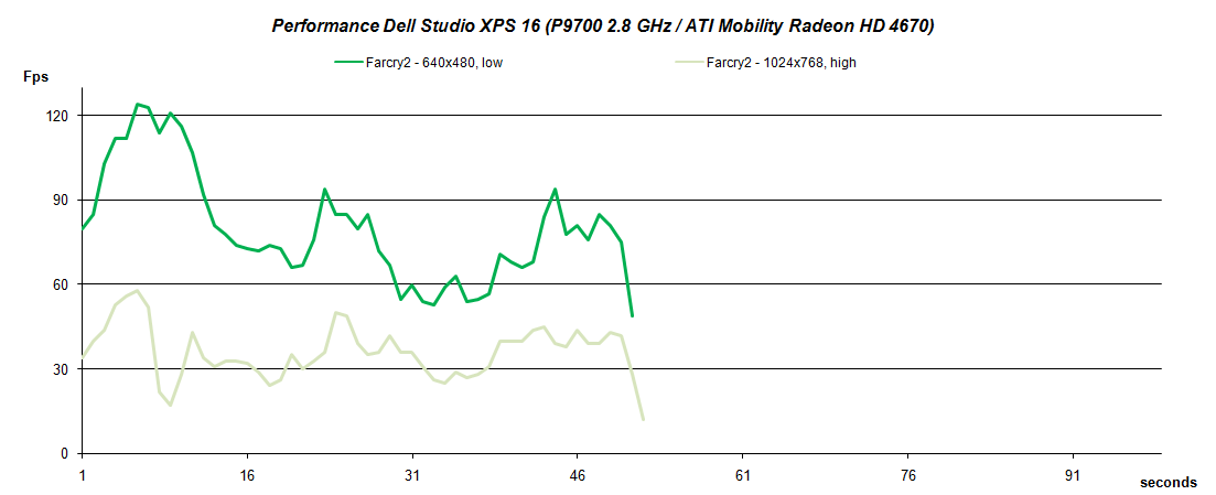 Einen kurzen Abstecher machten wir auch zum spielerisch umstrittenen Farcry2, das wir sowohl anhand des integrierten Benchmarks als auch im praktischen Gameplay überprüften. Im Benchmarktest schafft das Dell Studio XPS 16 bei hoher Detailstufe durchschnittlich 35,93 Fps und blieb bis auf einige Ausrutscher über der kritischen 30 Fps Marke. Der praktische Test lieferte bei gleicher Auflösung, allerdings etwas verringerten Details, eine konstant flüssige Bildfolge.
