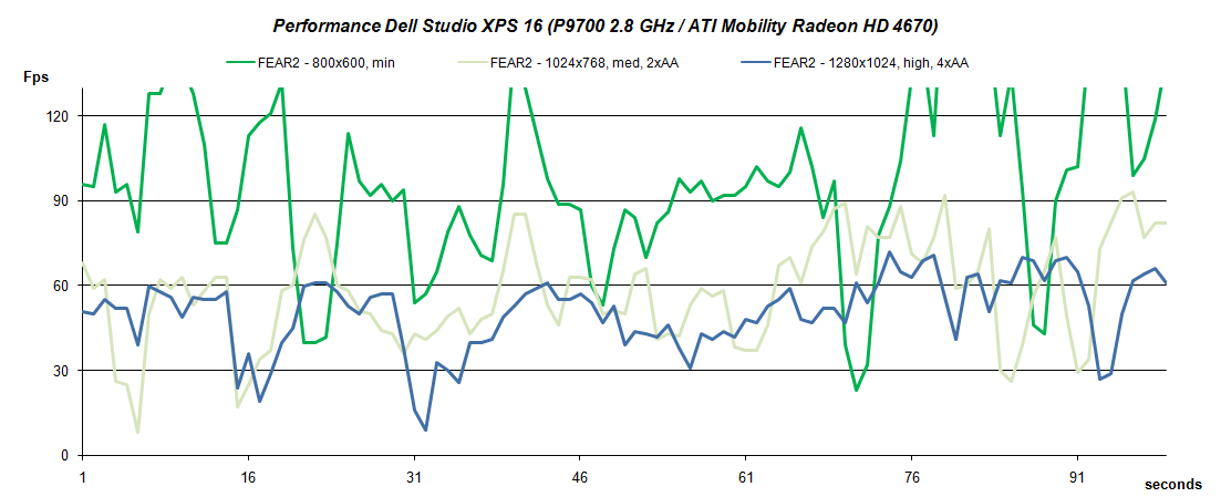 Wie gewohnt testen wir den Grusel-Shooter auf drei Detailstufen anhand des Anspielens der ersten Singleplayer Mission des Demos. Fraps protokollierte dabei eine hohe Framerate (800x600, low) von durchschnittlich 104,24 Fps, wobei die Bildwiederholungsrate kurzzeitig auch unter 30 Fps einbrach. Auf durchschnittlich 62,48 Fps kam das Studio XPS 16 dann bei mittleren Details, wobei sich die Fps-Rate überwiegend im Bereich zwischen 30 und 60 Fps befindet und auch Einbrüche auf unter 15 Fps zu verzeichnen sind.