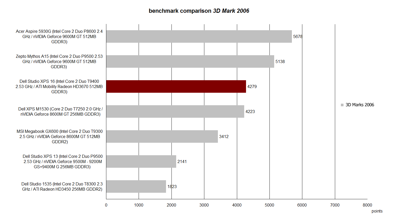 Im 3D Mark Benchmarktest erreicht das XPS 16 mit 4279 Punkten ein nur mäßiges Ergebnis. Von Notebooks mit gleichwertiger Grafik sind Werte von bis zu 4700 Punkte bekannt. Damit positioniert sich das XPS 16 nahezu gleichauf mit dem „theoretischen“ Vorgänger, dem XPS M1530, ausgestattet mit Geforce 8600M GT Grafik. Warum „theoretischer“ Vorgänger werden Sie vermutlich fragen?